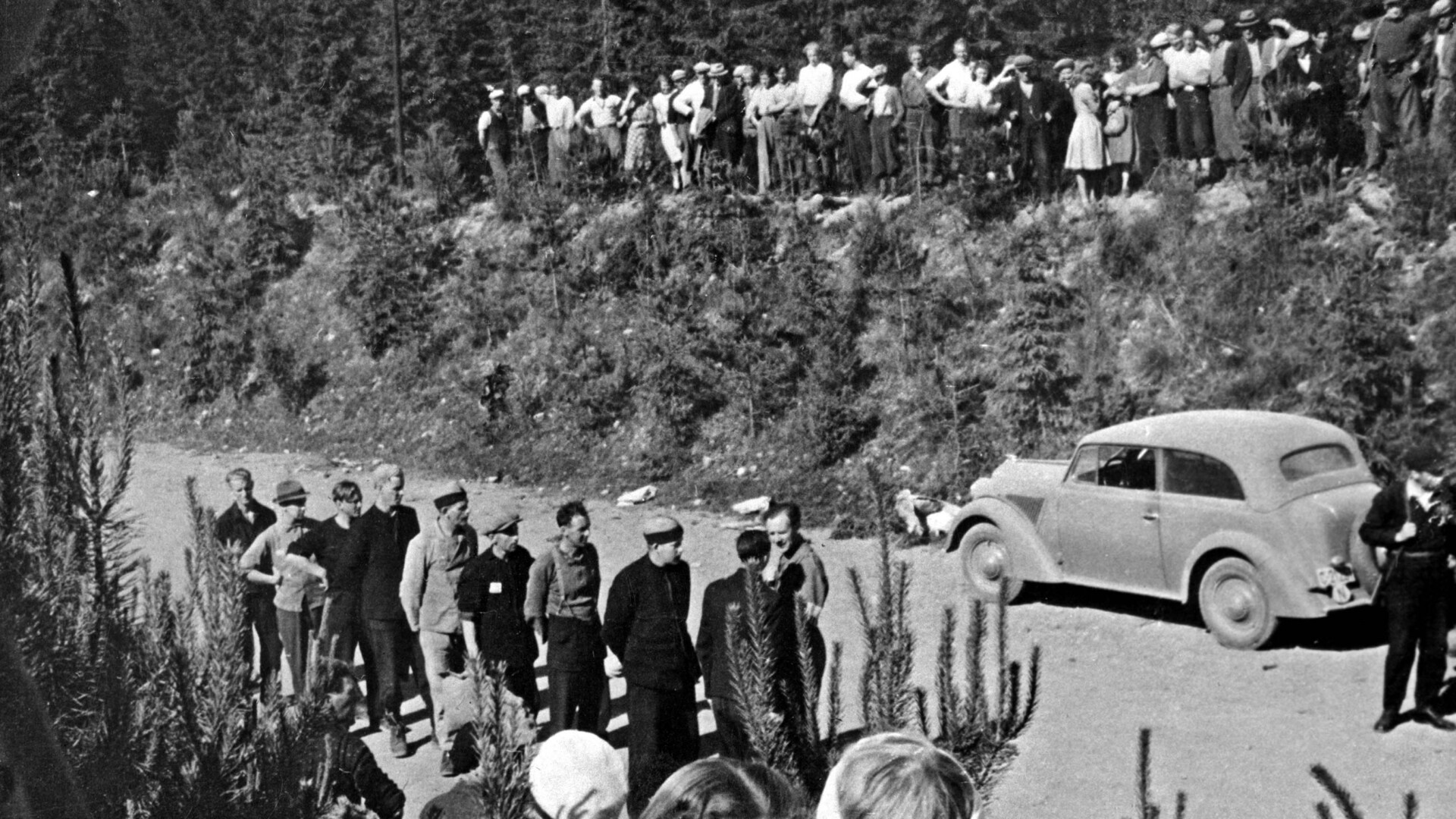 Ofrene fra Trandumskogen ble hentet opp fra massegravene i mai–juni 1945. Tyske og norske nazister ble tvunget til å stå for arbeidet, som fikk massiv oppmerksomhet og preget nasjonale nyheter. Folk på Romerike kom for å se hva som hadde skjedd i nabolaget; norske nazister ble hentet for med egne øyne å se hva de i det lengste benektet. Foto: MiA – Museene i Akershus.